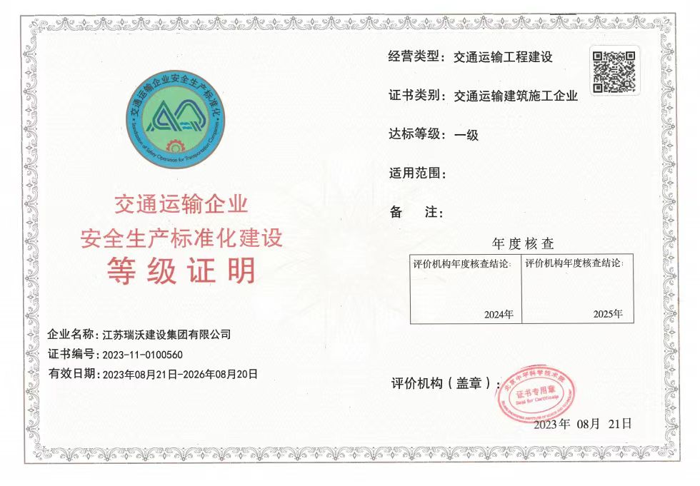 江蘇瑞沃建設集團有限公司成立于2007年,是一家以市政、交通工程建設為主導,集房屋建筑、交通安全設施、城市道路照明工程、電力工程、隧道工程、航道工程及投融資為一體的綜合性企業。企業注冊資本60000萬元,現有各類技術人員580人,其中中、高級以上人員498人,注冊類人員268人,一、二級建造師166人。公司榮獲“江蘇省建筑業優秀企業”、“江蘇省五一勞動獎狀”,連續多年被評為“揚州市先進企業”、“江蘇省建筑業百強企業”,連續八年蟬聯百強企業基礎設施類第一名。